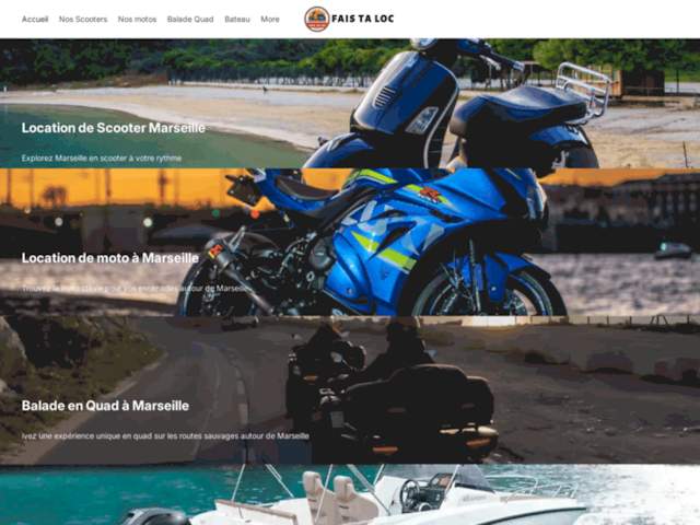 Bienvenue chez Faistaloc, votre spécialiste de location de scooters et ATV à Marseille. Nous proposons une large gamme de véhicules pour vous permettre de découvrir cette magnifique ville et ses paysages exceptionnels. Que vous souhaitiez louer un Scooter ou un ATV, notre service est rapide, fiable et convivial, vous garantissant une expérience inoubliable.