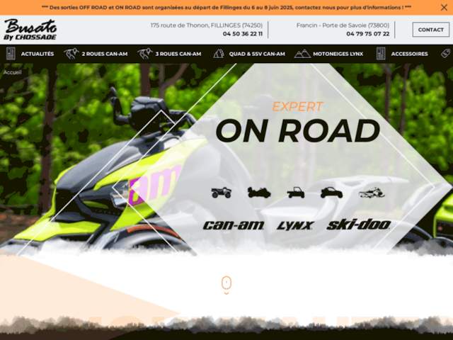 Bienvenue chez Busato by CHOSSADE, votre concessionnaire QUAD et spécialiste des véhicules de loisirs motorisés dans les deux Savoie. Situés stratégiquement à Porte-de-Savoie (73) et à Fillinges (74), nos concessions vous accueillent pour une expérience complète dans l’univers des sports motorisés. Depuis plus de 40 ans, Busato by CHOSSADE est le distributeur officiel en France des marques CAN-AM, LYNX et SKI-DOO, garantissant performance, fiabilité et innovation. Notre équipe d’experts passionnés est à votre disposition pour vous conseiller au mieux, que ce soit pour l’achat, l’entretien ou l’essai de vos véhicules. Découvrez notre large gamme de quads, SSV, Spyder et Ryker, conçus pour répondre à toutes vos envies de liberté et de sensations fortes. Que vous soyez amateur de sports mécaniques ou en quête de solutions modernes et respectueuses de l’environnement, nos véhicules vous offrent confort, puissance et sécurité. En tant que distributeur exclusif des motoneiges Lynx et Ski-Doo, nous proposons également une gamme complète de véhicules pour la montagne, idéaux pour les professionnels comme pour les passionnés. Venez vivre une expérience unique dans un univers où innovation rime avec savoir-faire, et laissez-vous séduire par la performance et la sécurité de nos produits. Rejoignez-nous dans nos concessions pour découvrir nos offres spéciales et profiter de notre accompagnement personnalisé. Avec une expertise solide et une passion partagée, Busato by CHOSSADE est votre partenaire privilégié pour tous vos projets de mobilité motorisée dans les Savoie.