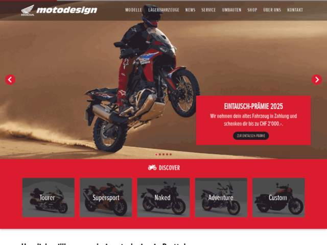 Motodesign AG est votre concessionnaire de motos de confiance situé à Pratteln, au cœur de la Suisse. Forte d'une expérience de plus de 15 ans, notre entreprise est spécialisée dans la vente, le service et la personnalisation de motos japonaises, avec un accent particulier sur la marque Honda. En tant que plus grand concessionnaire de motos Honda de la région, nous vous proposons un large éventail de modèles, allant des sportives aux tourers, en passant par les Naked bikes et les motos customisées. Notre passion pour les motos Honda transparaît dans notre engagement à fournir à nos clients des produits de qualité supérieure et un service irréprochable.