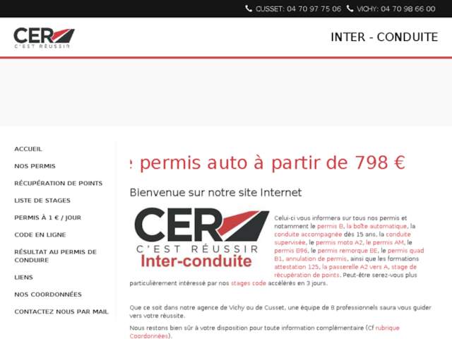 Bienvenue chez CER Inter-Conduite, votre auto-école de référence à Cusset - Vichy. Notre établissement est reconnu pour sa pédagogie de qualité et son professionnalisme dans la formation à la conduite. Que vous soyez débutant ou que vous souhaitiez perfectionner vos compétences, nous proposons une large gamme de formations adaptées à vos besoins : permis Auto (B), formation Conduite Accompagnée (AAC), permis Moto (A, A1), Cyclo et BSR. Notre équipe d'instructeurs expérimentés vous accompagnera tout au long de votre parcours pour vous garantir une réussite optimale.