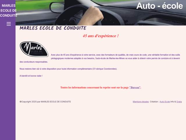 Bienvenue chez Marles Ecole de Conduite, votre auto-école de confiance située à Marles-les-Mines, dans le Pas-de-Calais. Avec ses 45 ans d'expérience, notre école vous propose une formation complète et de qualité pour vous préparer à l'obtention de votre permis de conduire. Nos formateurs, experts et passionnés, mettent un point d'honneur à vous offrir des cours personnalisés, adaptés à vos besoins et à votre rythme d'apprentissage.